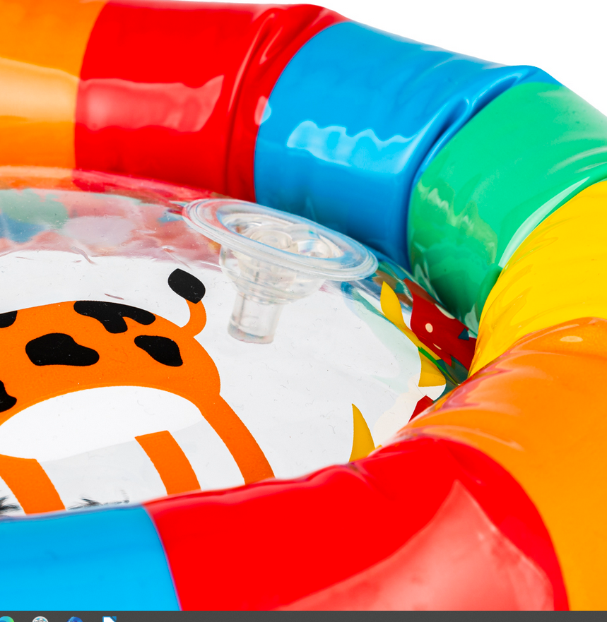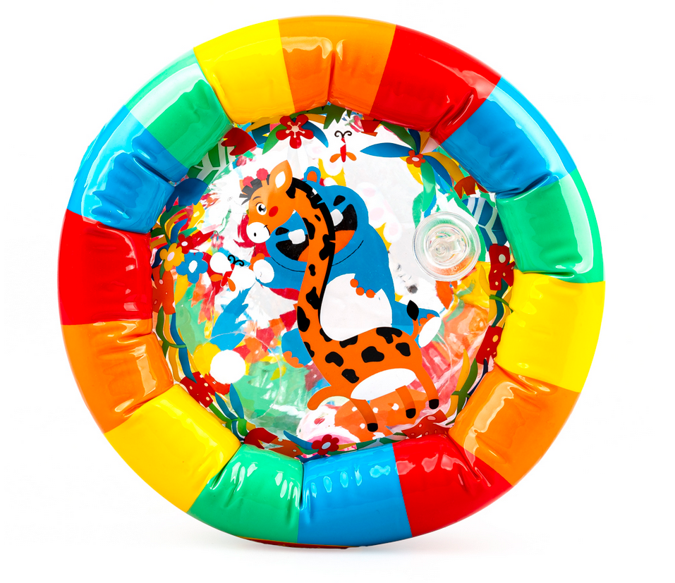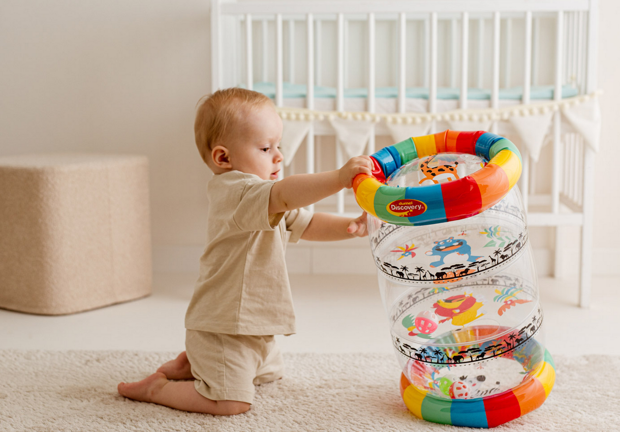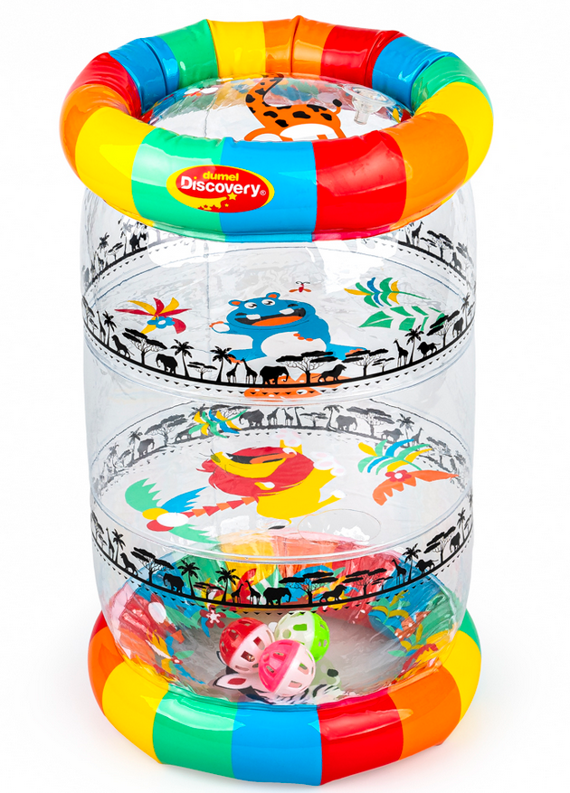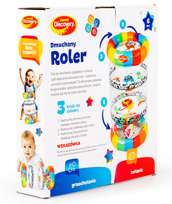 Kolorowa zabawa na wyciągnięcie rączki malucha! Ten pomysłowy roler posiada trzy zawory, umieszczone na poszczególnych segmentach, pozwalające na napełnienie go powietrzem, aby nabrał kształtu. Wewnątrz rolera znajdują się grzechoczące piłeczki, które przy potrząsaniu zabawką wydają wesoły dźwięk. Rolerem można bawić się na cztery różne sposoby, turlając go przed sobą i raczkując za nim, potrząsając nim i słuchając grzechocących piłeczek, ustawiając go pionowo i manewrując nim w taki sposób, aby piłeczki wpadły w otwory, a także zaglądając do środka przez przezroczyste ścianki i oglądając obrazki, zdobiące roler. Dzięki możliwości spuszczenia powietrza z zabawki, złożony na płasko roler zajmuje niewiele miejsca.