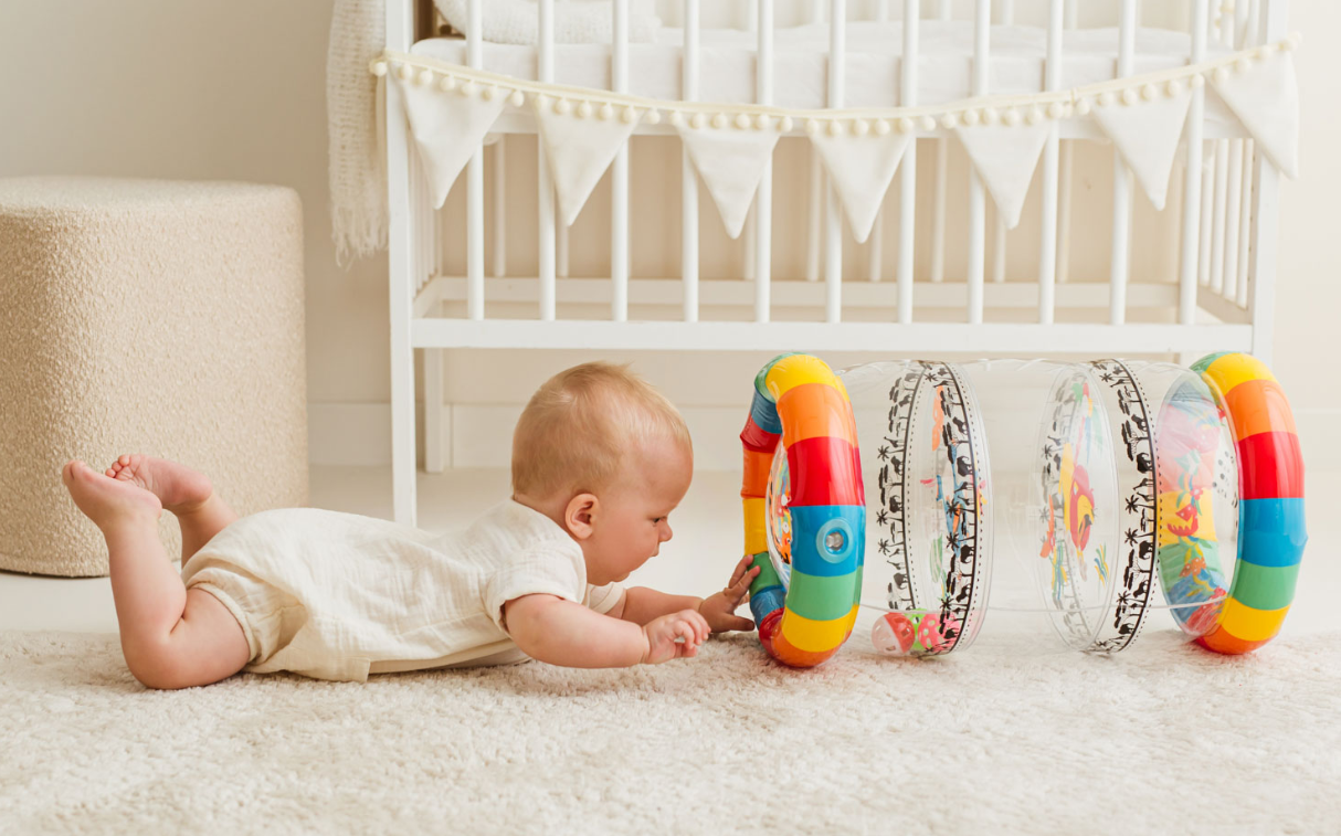 4 sposoby na zabawę z Rolerem: 1) turlaj roler, raczkując za nim; 2) trzęś rolerem, aby słuchać grzechotania piłeczek; 3) ustaw roler pionowo i manewruj nim tak, aby piłki wpadały w otwory; 4) zajrzyj przez przezroczyste ścianki i oglądaj obrazki;
