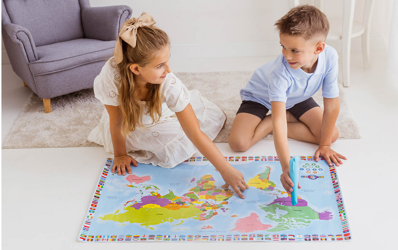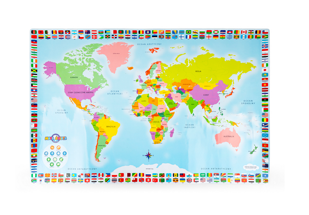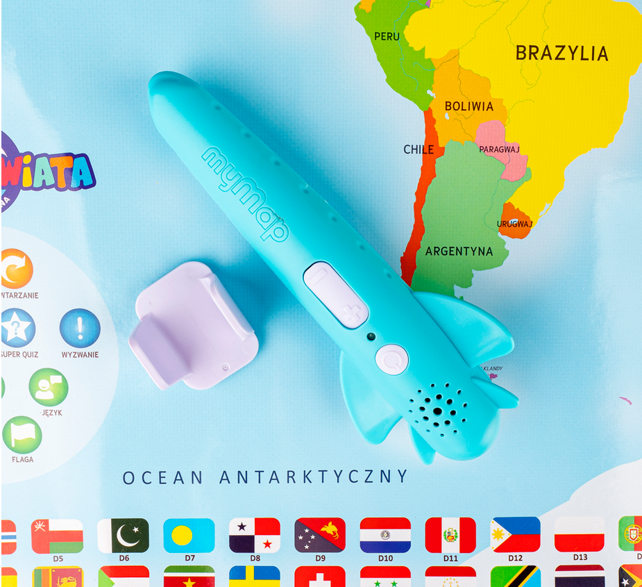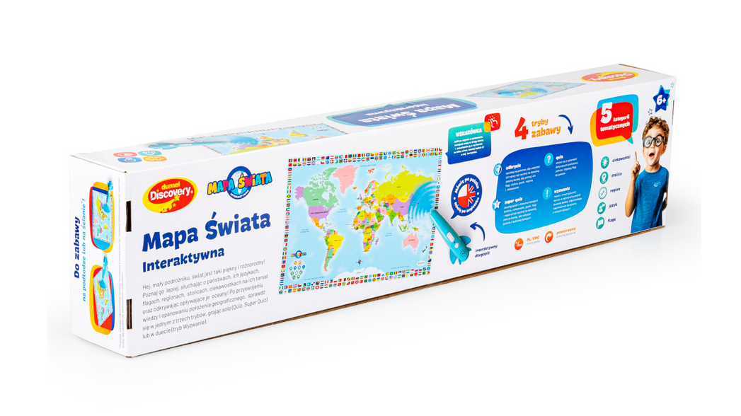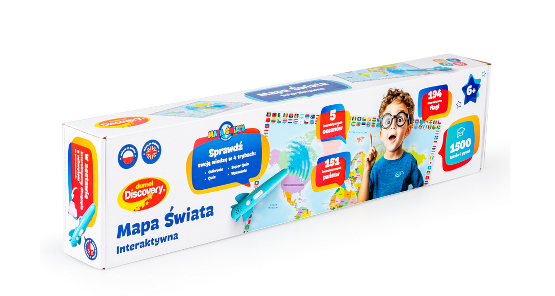 Zapraszamy na podróż dookoła świata… długopisem po mapie! Ten odlotowy, edukacyjny zestaw kryje w sobie kolorową mapę oraz interaktywny długopis w kształcie samolotu, który aktywuje dźwięki, pozwalając małym podróżnikom na odkrywanie oceanów, państw i ich flag. Na mapie znajdują się aktywne pola, które w połączeniu z interaktywnym długopisem z zestawu opowiadają o państwach, przekazując różne informacje oraz ciekawostki na ich temat. Zabawka jest dwujęzyczna (polsko-angielska), dzięki czemu po przyswojeniu wiedzy w języku polskim, dziecko może ćwiczyć znajomość języka obcego, próbując swych sił w wersji anglojęzycznej. Do wyboru są cztery tryby zabawy. Pierwszy (Odkrycie) to tryb nauki, w którym słuchamy nazw i informacji, trzy kolejne (Quiz, Super Quiz oraz Wyzwanie), to tryby rozrywki, w których można sprawdzić swoją wiedzę, odpowiadając na pytania. Quiz oraz Super quiz umożliwiają grę solo, a tryb Wyzwanie – emocjonującą rozgrywkę w duecie.